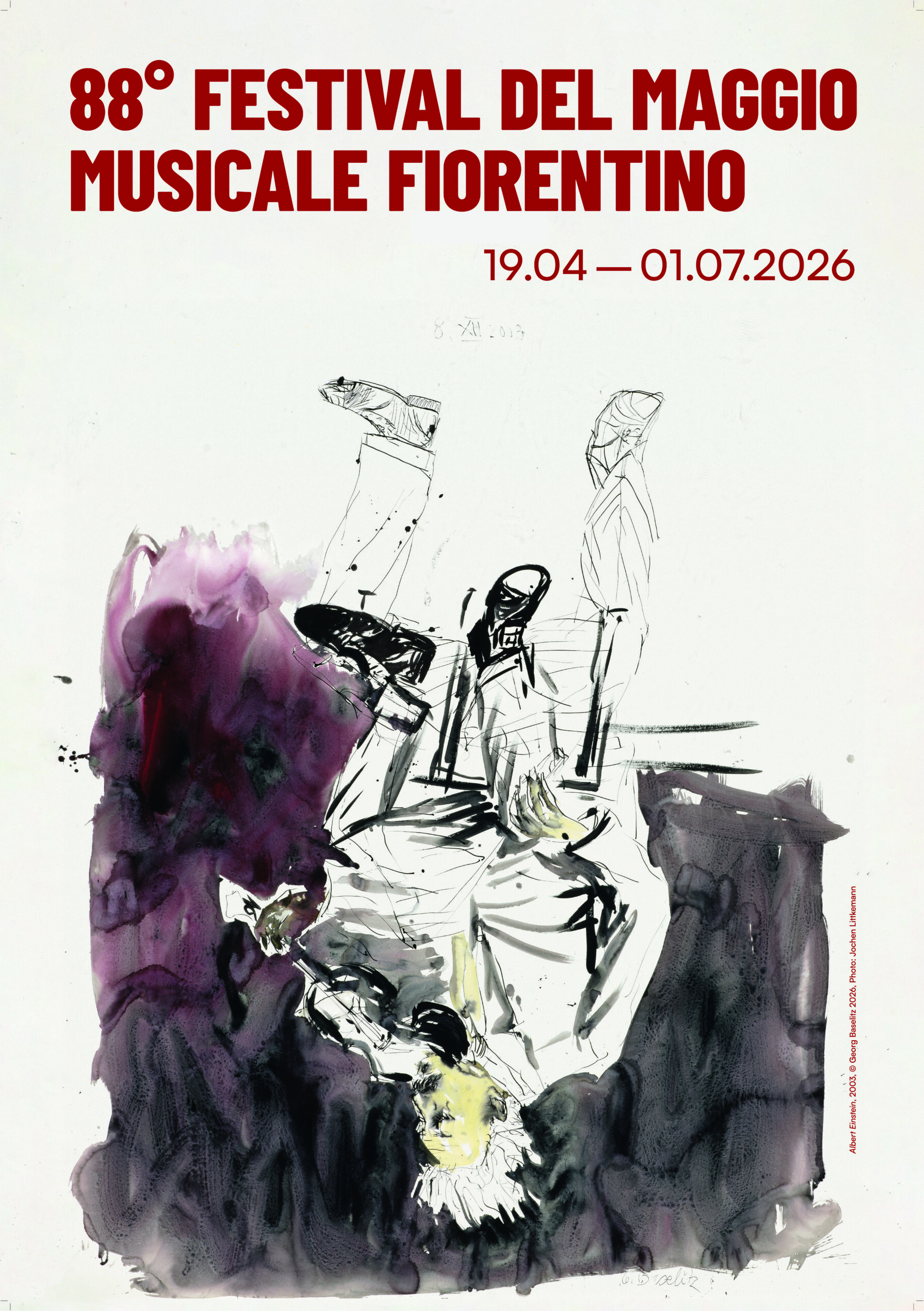 Il Sovrintendente Carlo Fuortes ha presentato il mosaico di collaborazioni con le maggiori istituzioni del territorio e il manifesto ufficiale dell’88ª edizione, frutto della feconda collaborazione con il Museo Novecento e il suo direttore Sergio Risaliti. L’immagine porta la firma di uno dei giganti dell’arte contemporanea mondiale, Georg Baselitz che ha scelto per il Maggio un soggetto di profonda suggestione: Albert Einstein colto nell’atto di suonare il violino. L’opera, caratterizzata dal celebre «capovolgimento» della figura tipico dell’artista, “trasforma lo scienziato in un’icona della creatività pura, unendo musica e scienza in un segno rapido e nervoso che sfida le certezze e invita a nuove prospettive” spiega Sergio Risaliti.