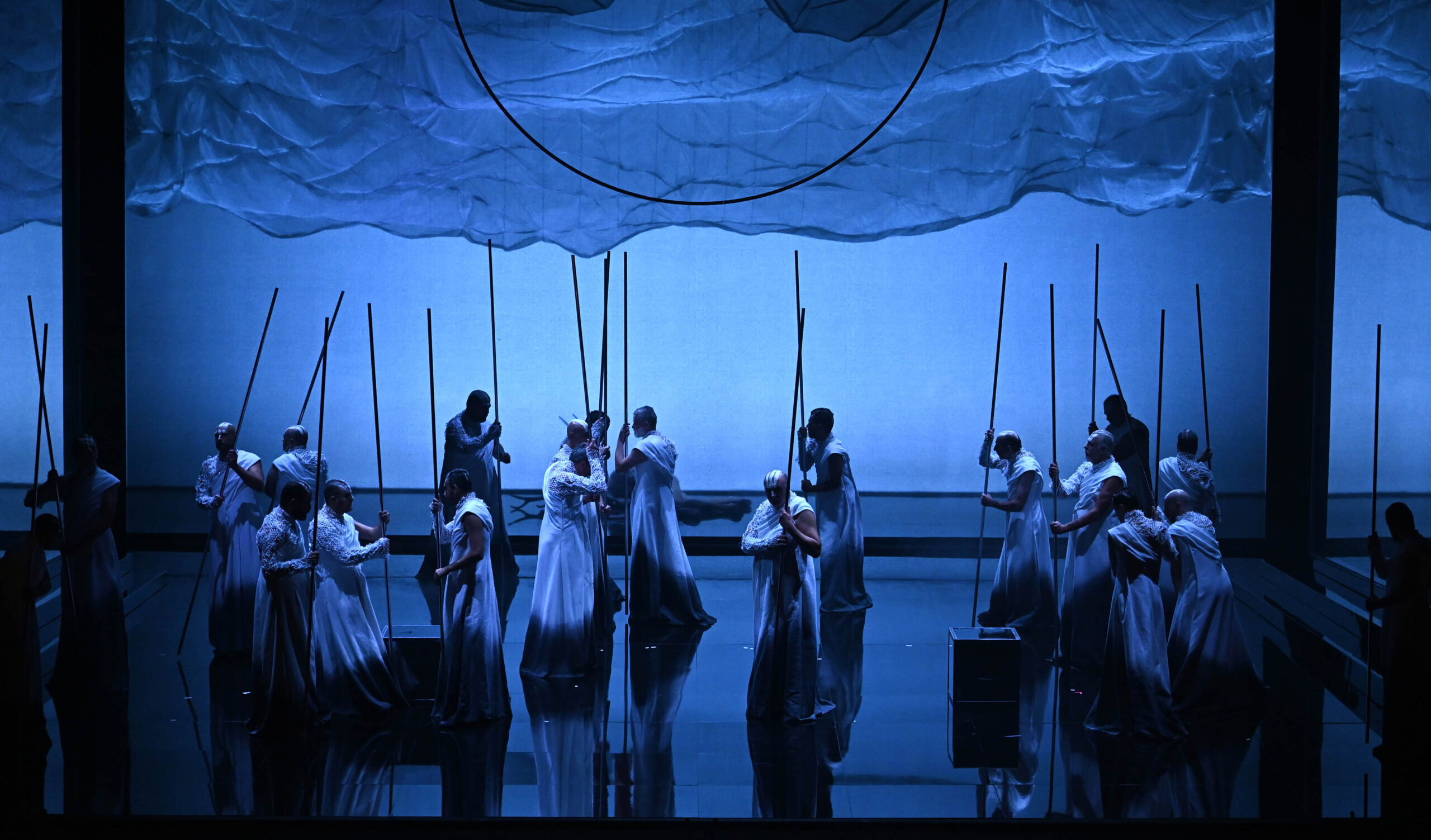 Lo spettacolo evidenzia la contrapposizione di due mondi, quello dei conquistatori romani raffigurato attraverso una fisicità lineare e quello evocativo, esoterico e lunare del mondo di Norma, un universo culturale che ha attraversato, con le sue mitologie fiabesche e notturne la cultura romantica dell’Ottocento italiano. Un cerchio che diventa luna, rappresenta lo spazio tra questi due mondi. Scene e costumi definiscono l’ambiente con grandi specchi laterali e pochi elementi architettonici stilizzati, dove dominano blu, bianco e rosso che, nel finale, è preponderante.