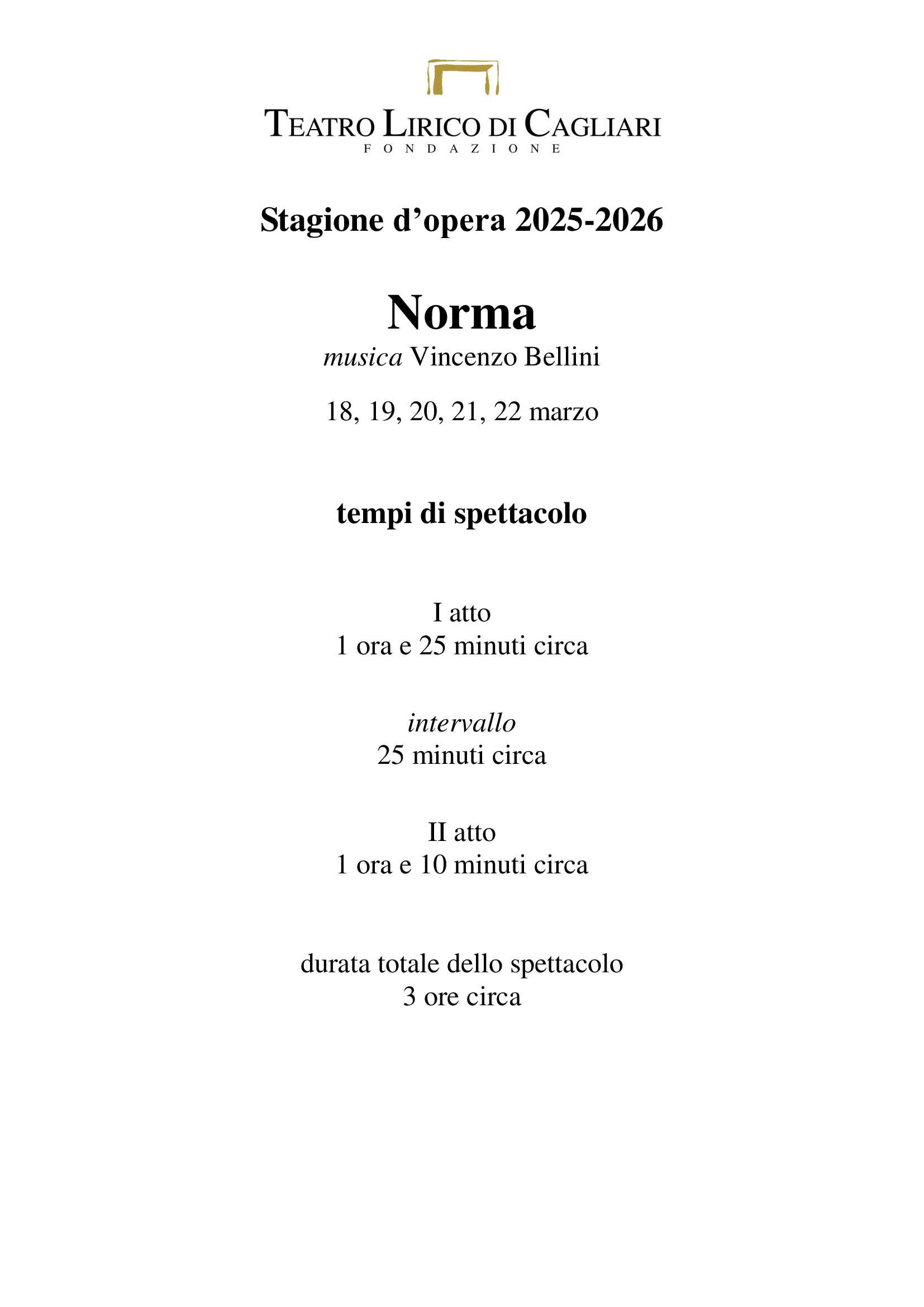 Mercoledì 18 marzo alle 20 va in scena il terzo, atteso appuntamento della Stagione d’opera 2025-2026 del Teatro Lirico di Cagliari: Norma, tragedia lirica in due atti su libretto di Felice Romani, dalla tragedia Norma ou L’infanticide di Alexandre Soumet, e musica di Vincenzo Bellini (Catania, 1801 – Puteaux, 1835), la cui ultima esecuzione a Cagliari risale a 12 anni fa (aprile-maggio 2014).