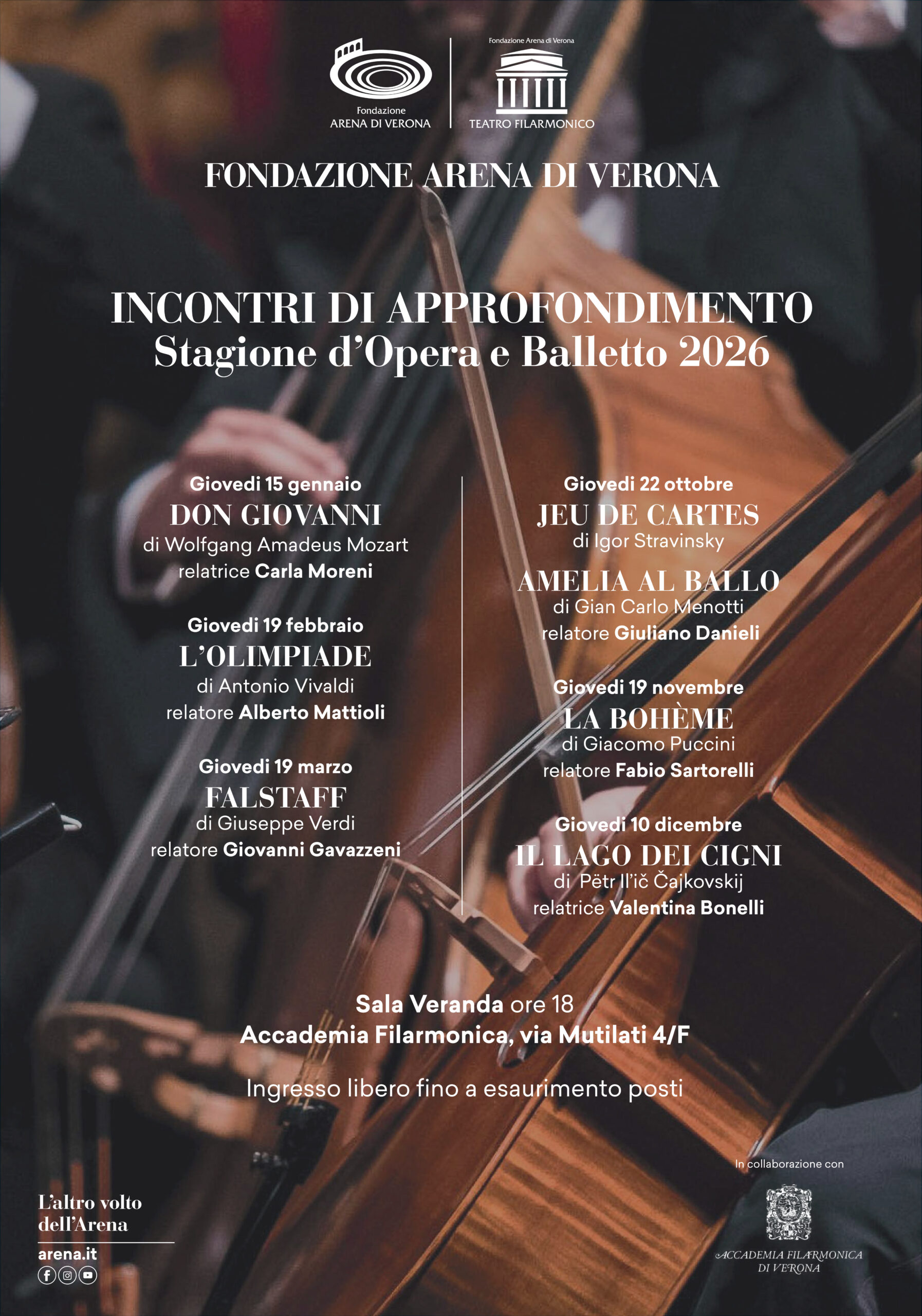 Per tutta la Stagione d’Opera e Balletto 2026 si confermano gli incontri gratuiti di approfondimento, in collaborazione con Accademia Filarmonica di Verona, i giovedì precedenti le prime. Falstaff sarà presentato al pubblico giovedì 19 marzo alle 18 nella prestigiosa Sala Veranda dell’Accademia Filarmonica (via Mutilati 4) dal giornalista, critico e scrittore Giovanni Gavazzeni. Ingresso libero fino ad esaurimento posti.