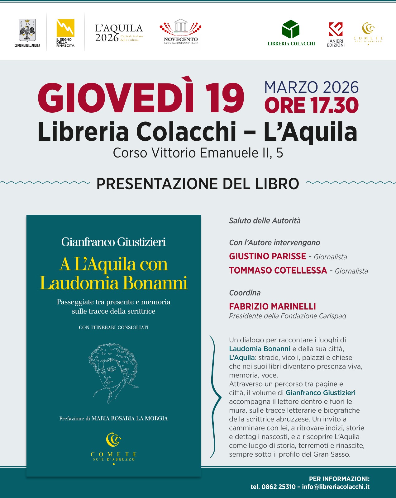 L’AQUILA – Giovedì 19 marzo 2026, alle ore 17:30, presso la libreria Colacchi a L’Aquila (Corso Vittorio Emanuele, 5), ci sarà la presentazione del nuovo libro di Gianfranco Giustizieri “A L’Aquila con Laudomia Bonanni. Passeggiate tra presente e memoria sulle tracce della scrittrice”, con la Prefazione di Maria Rosaria La Morgia, per la Collana “Comete Scie d’Abruzzo” Edizioni Ianieri di Pescara. Durante l’incontro, il Presidente della Fondazione Carispaq Fabrizio Marinelli, i giornalisti Giustino Parisse e Tommaso Cotellessa dialogheranno con l’Autore.