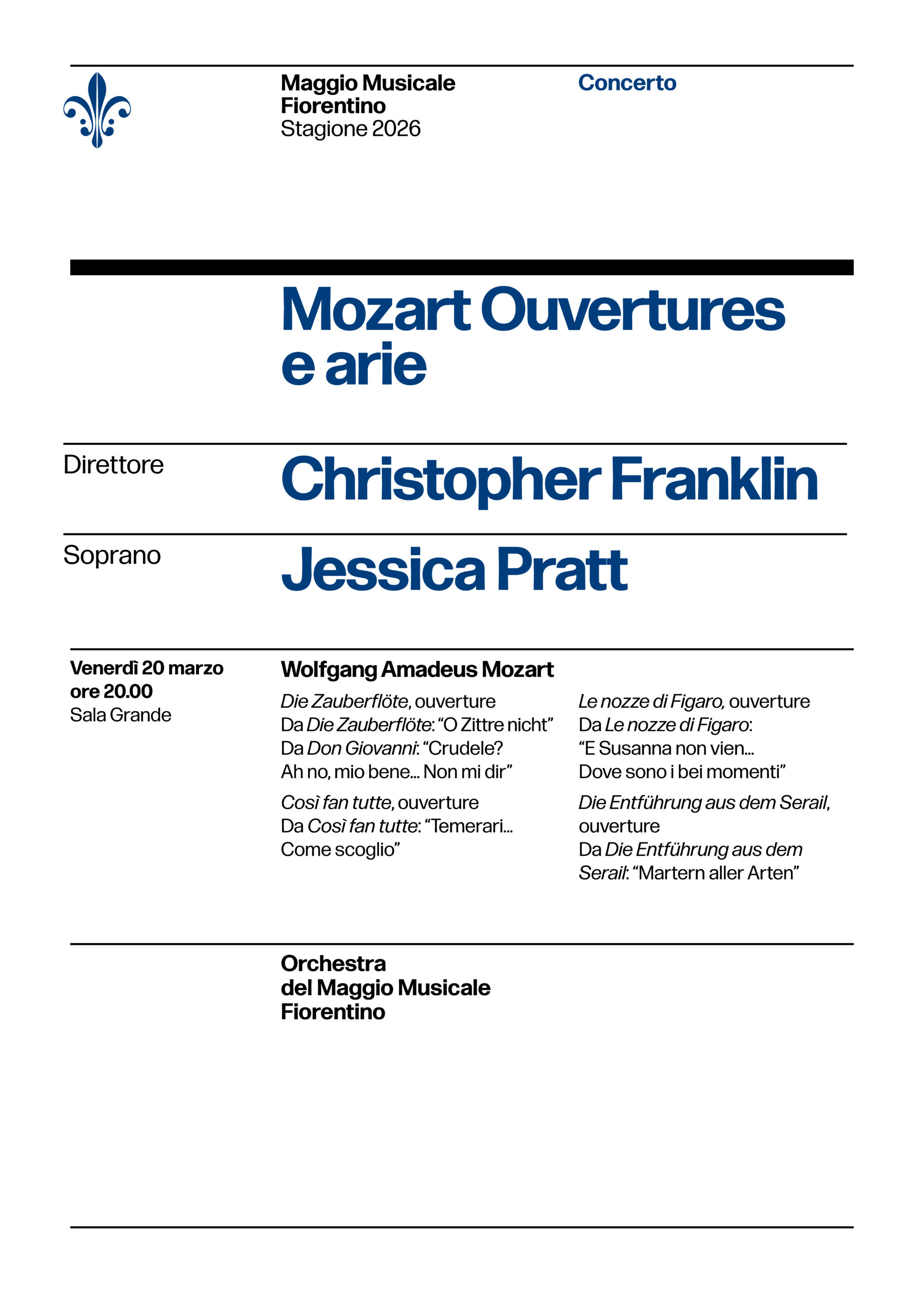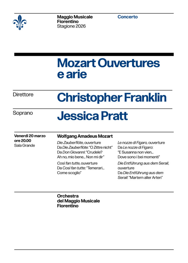 Il concerto del 20 marzo nasce come estensione e introduzione al recente progetto discografico dedicato a Mozart, inciso da Christopher Franklin e Jessica Pratt insieme all’Orchestra del Maggio: un lavoro che viene così mostrato ‘dal vivo’ al pubblico. Il programma propone una selezione di ouvertures e arie tratte da alcune delle opere più amate del genio di Salisburgo, delineando un percorso musicale di alcune delle sue composizioni più famose.