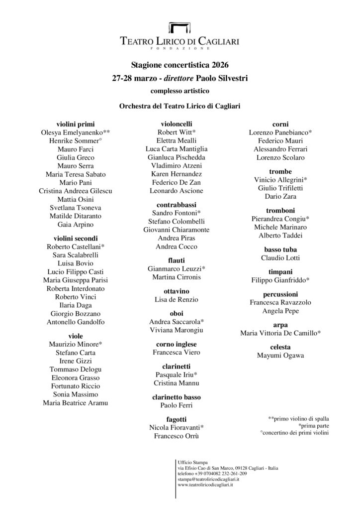 Teatro Lirico di Cagliari, via Efisio Cao di San Marco, 09128 Cagliari – Italia telefono +39 0704082209 – stampa@teatroliricodicagliari.it – www.teatroliricodicagliari.it