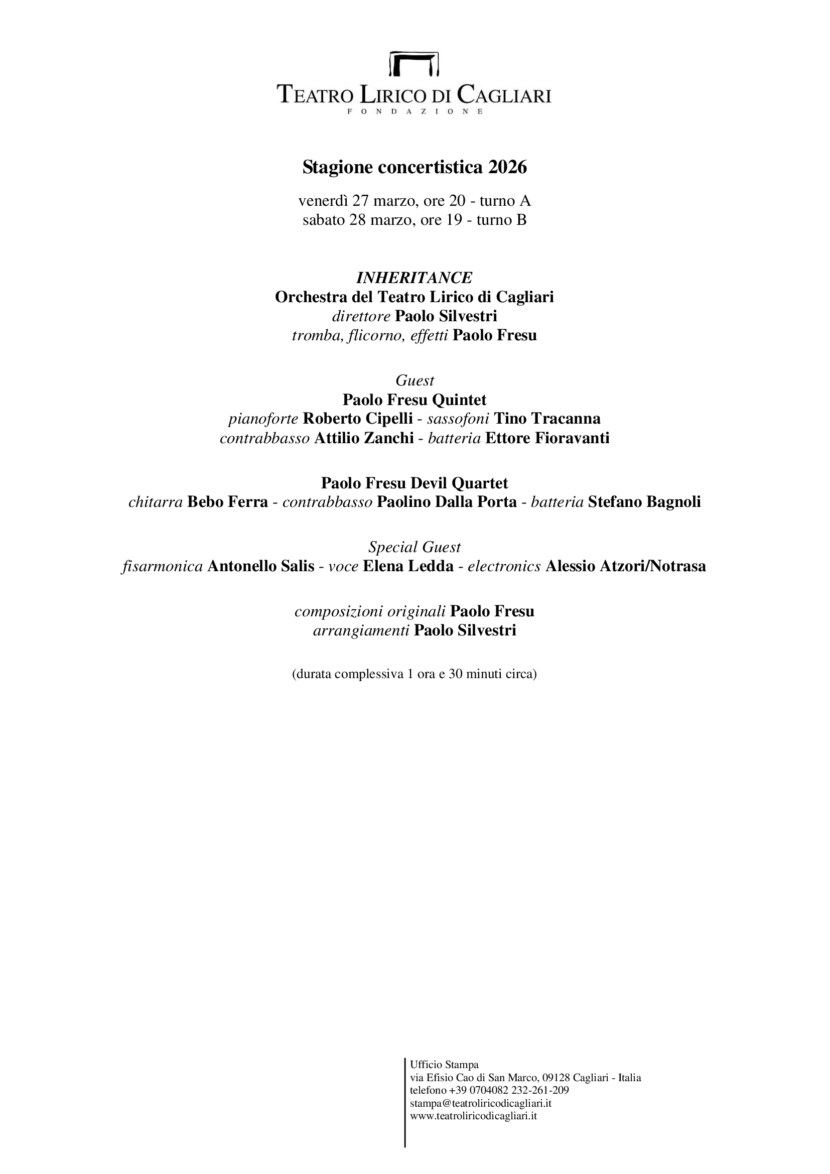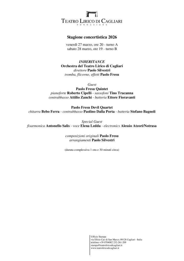 Venerdì 27 marzo alle 20 (turno A) e sabato 28 marzo alle 19 (turno B) è in programma il quinto, attesissimo, appuntamento della Stagione concertistica 2026 del Teatro Lirico di Cagliari che prevede due serate assolutamente straordinarie, uniche e probabilmente irripetibili: Paolo Silvestri (Genova, 1960), compositore, arrangiatore, direttore d’orchestra e pianista che da molti anni sperimenta l’incontro di linguaggi differenti coniugando il jazz e la musica contemporanea con le tradizioni musicali popolari di tutto il mondo, debutta a Cagliari dirigendo un importante progetto intitolato INHERITANCE: il dialogo, per la prima volta, dell’Orchestra del Teatro Lirico di Cagliari con Paolo Fresu (Berchidda/Sassari, 1961) e con una serie di prestigiosi musicisti che, in qualità di ospiti-solisti, danno lustro alle due serate previste come Antonello Salis, Elena Ledda, Roberto Cipelli, Tino Tracanna, Attilio Zanchi, Ettore Fioravanti, Bebo Ferra, Paolino Dalla Porta, Stefano Bagnoli, Alessio Atzori.