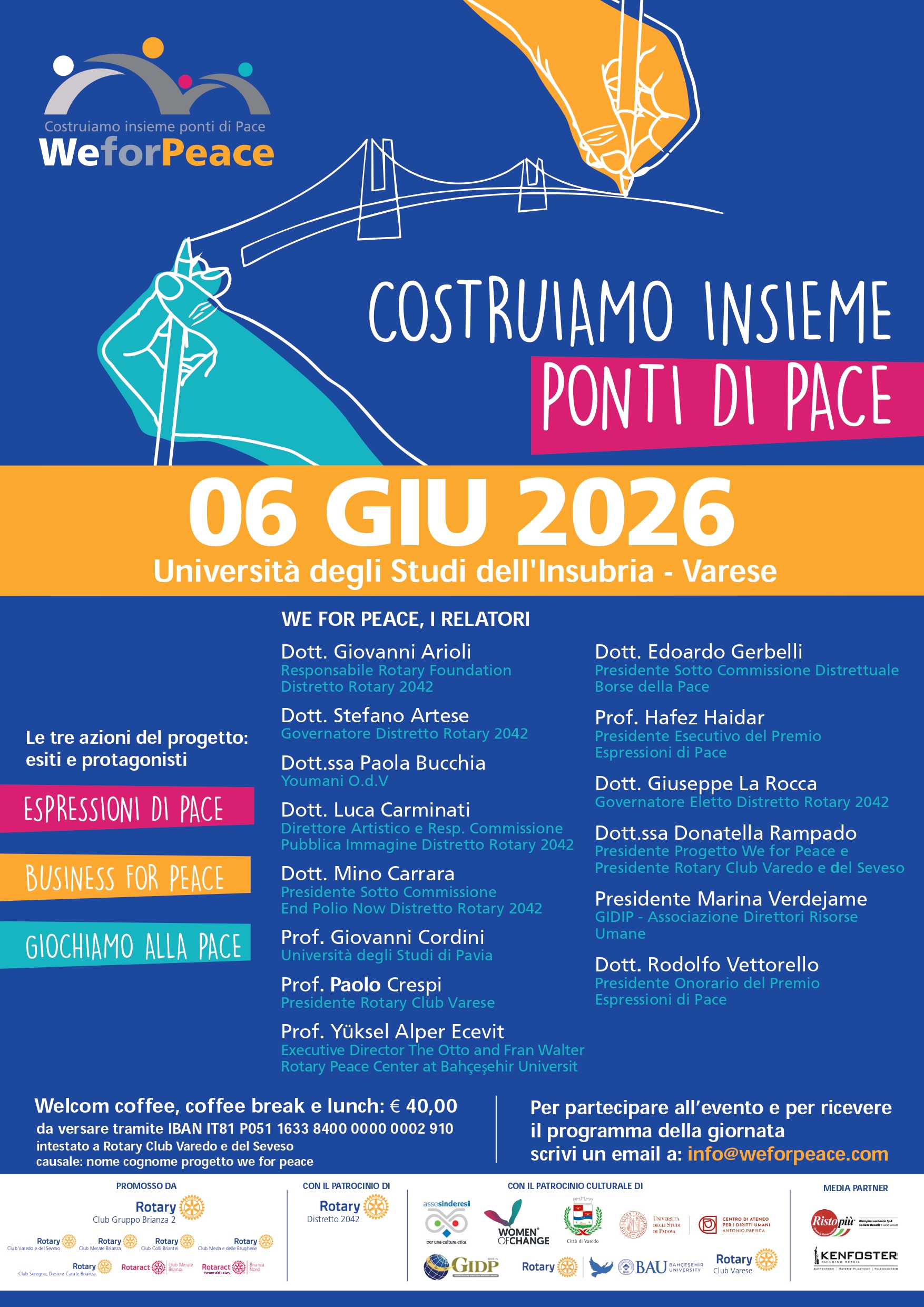 Sabato 6 giugno 2026, a Varese, presso l’Università degli Studi dell’Insubria, si terrà l’evento “We for Peace – Costruiamo insieme ponti di pace”, giornata dedicata agli esiti e ai protagonisti delle tre azioni che compongono il progetto: Giochiamo alla Pace, Premio Culturale Espressioni di Pace e Business for Peace.