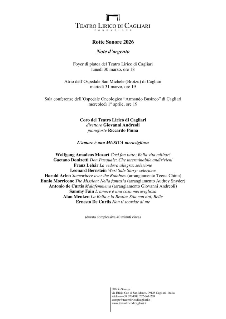 Martedì 31 marzo e mercoledì 1° aprile sempre alle 19 nei Presidi ospedalieri dell’ARNAS “Giuseppe Brotzu” di Cagliari, atrio dell’Ospedale San Michele (31 marzo) e sala conferenze dell’Ospedale “Armando Businco” (1° aprile), è in programma un appuntamento musicale straordinario, intitolato Note d’argento: L’amore è una MUSICA meravigliosa, che propone un brillante e coinvolgente concerto interamente dedicato a celebri e popolari pagine musicali tratte da opere liriche, operette, musical, film e canzoni, nell’interpretazione del Coro del Teatro Lirico di Cagliari diretto da Giovanni Andreoli. L’accompagnamento al pianoforte è di Riccardo Pinna.