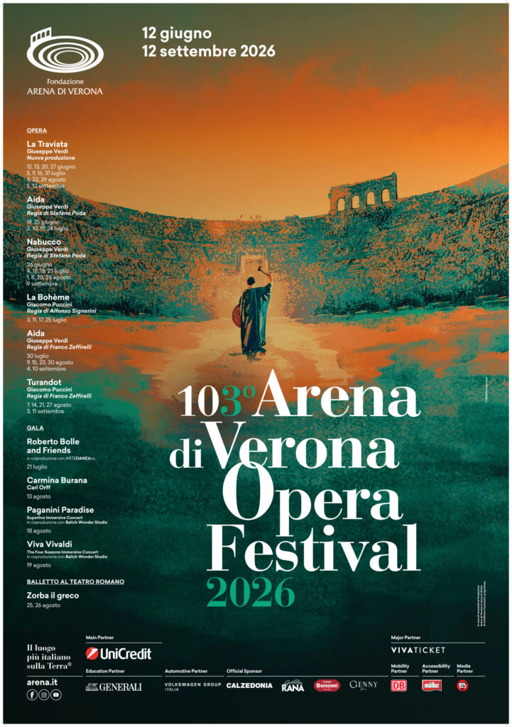 IL CARTELLONE 2026. Sono 52 le serate di spettacolo del 103° Arena di Verona Opera Festival 2026. Oltre alla Traviata inaugurale, la stagione proseguirà con altri cinque titoli d’opera fino al 12 settembre. Tornerà la regina dell’Arena Aida in due diversi allestimenti: quello “di cristallo” firmato da Stefano Poda, dal 19 giugno al 24 luglio e la produzione immaginata da Franco Zeffirelli dal 30 luglio al 10 settembre. Nabucco, dramma lirico di Verdi, nell’allestimento 2025 di Stefano Poda, torna in Arena per 10 rappresentazioni dal 26 giugno al 9 settembre. La Bohème, nell’allestimento curato da Alfonso Signorini per il Festival 2024, sarà nuovamente in scena per quattro sere dal 3 al 25 luglio. Un altro titolo di Puccini festeggerà 100 anni: Turandot, che tornerà dal 7 agosto all’11 settembre per sei serate nell’allestimento da fiaba di Zeffirelli (spettacolo record di incassi nella storia areniana) con i costumi del premio Oscar Emi Wada. Oltre all’atteso appuntamento di Roberto Bolle and friends il 21 luglio, coprodotto con ARTEDANZAsrl, e a Paganini Paradise, in prima assoluta il 18 agosto, nuova creazione di Balich Wonder Studio. Non mancherà il grande organico sinfonico-corale dispiegato dai Carmina Burana di Orff il 13 agosto e le Quattro stagioni il 19 agosto in Viva Vivaldi, con l’Orchestra di Fondazione Arena e spettacolari proiezioni tridimensionali e immersive firmate da Balich Wonder Studio. Oltre all’irresistibile Zorba il greco che riporterà la danza al Teatro Romano di Verona.