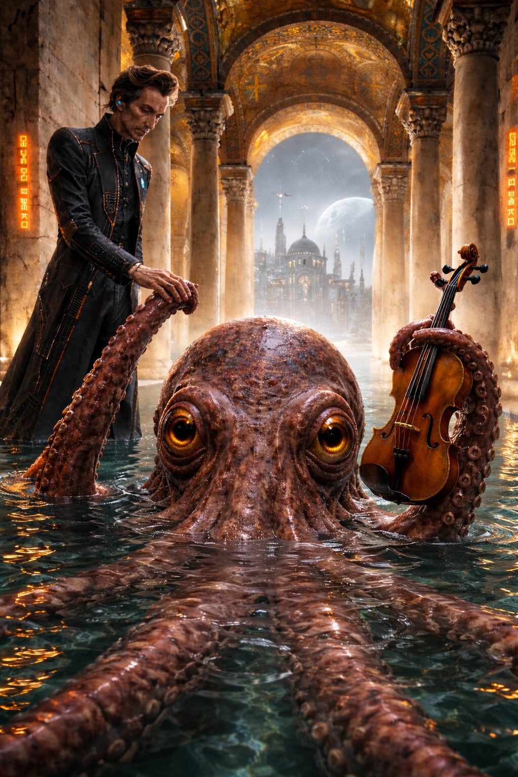Los tentáculos, convertidos en apéndices semejantes a manos, desplazan el arco con precisión; otros presionan distintas partes de la madera del violín, alterando la resonancia y generando inflexiones imposibles. Es una música completa, interpretada con cuerpo y alma. Recuerdo que los pulpos piensan con el cuerpo.