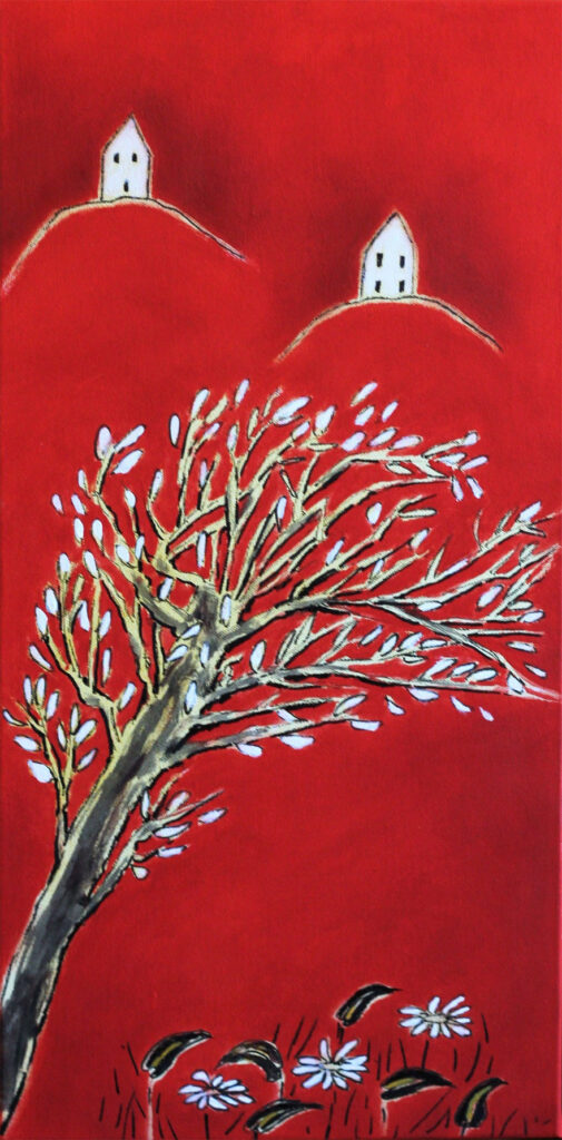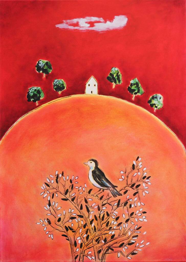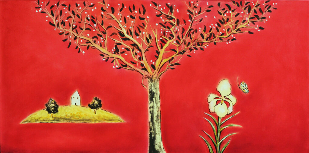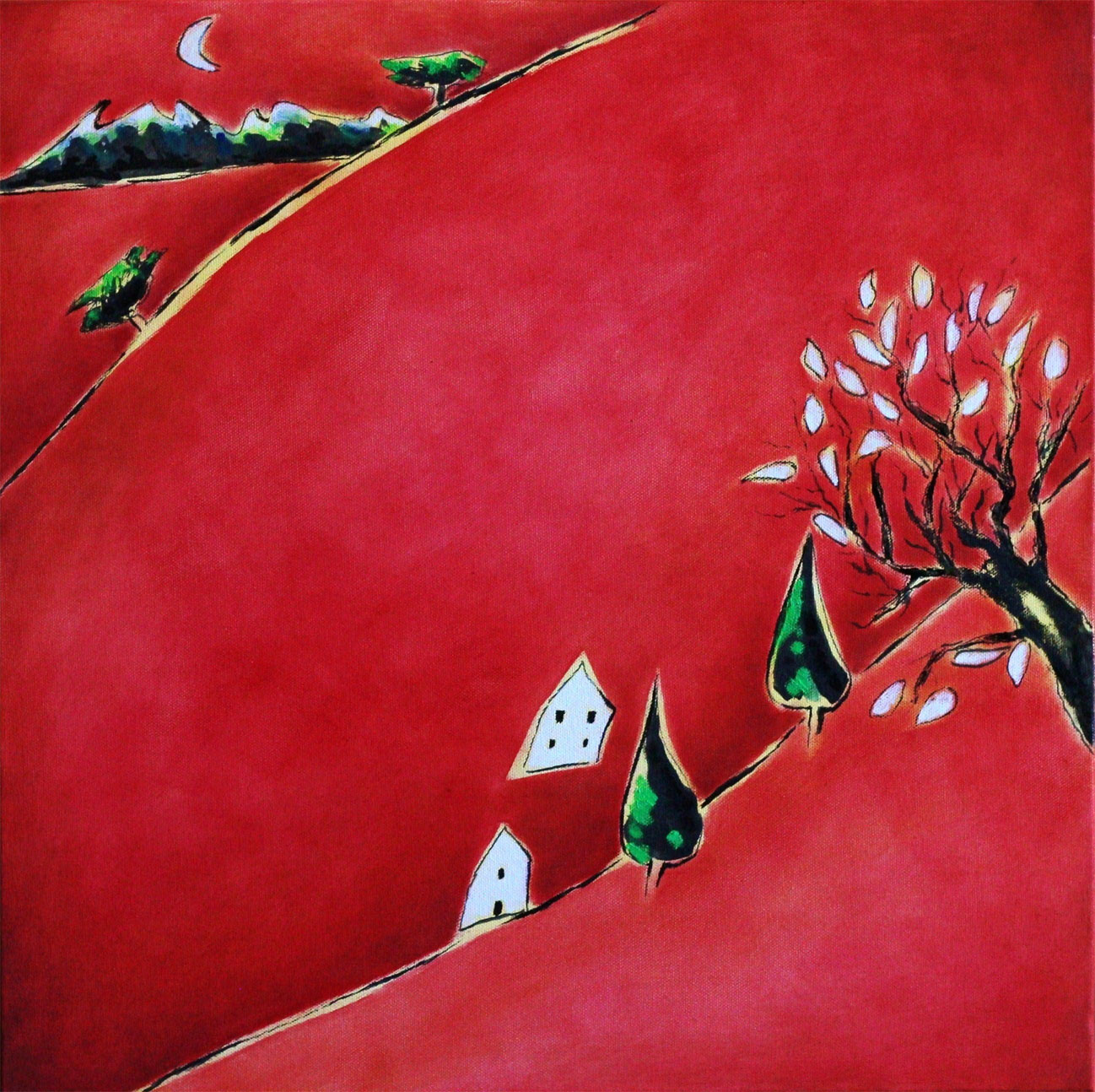 Il motivo caratterizzante delle opere in mostra è il paesaggio su sfondo rosso, perchè essendo il rosso il colore più caldo fa riferimento al riscaldamento globale del pianeta ed ai preoccupanti e sempre più accelerati cambiamenti climatici.