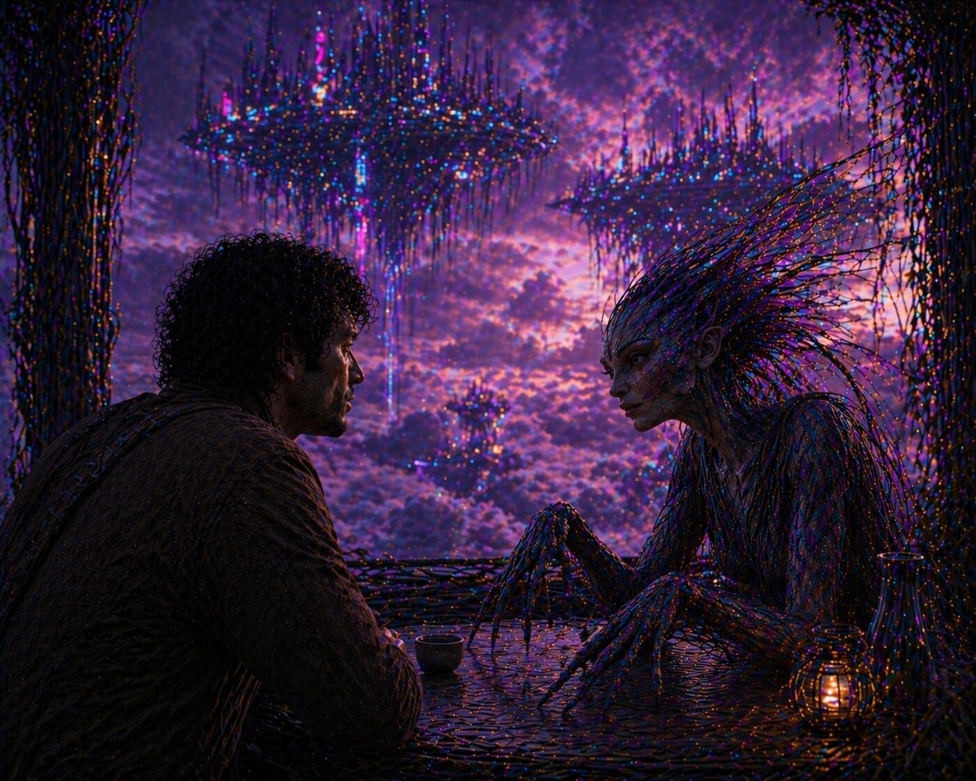 Sabía algo de la anatomía de Elote, pero enfrentarme a ella fue una experiencia de una intensidad inusitada. Largos apéndices planos, similares a alas de libélula surgían de las sienes. Dedos de falanges larguísimas, que parecían insectos. Manojos pilosos, de cierto brillo extraño, lucían palpitantes a la luz violeta del cielo. No puedo decir que era hermosa. No puedo decir nada acerca de lo que no es humano. Estamos malacostumbrados a asumir que la belleza y los patrones estéticos son los de nuestra especie. Ella era atractiva de otra manera. Elote pensé para mí y solo me senté sin saber cómo saludarla.